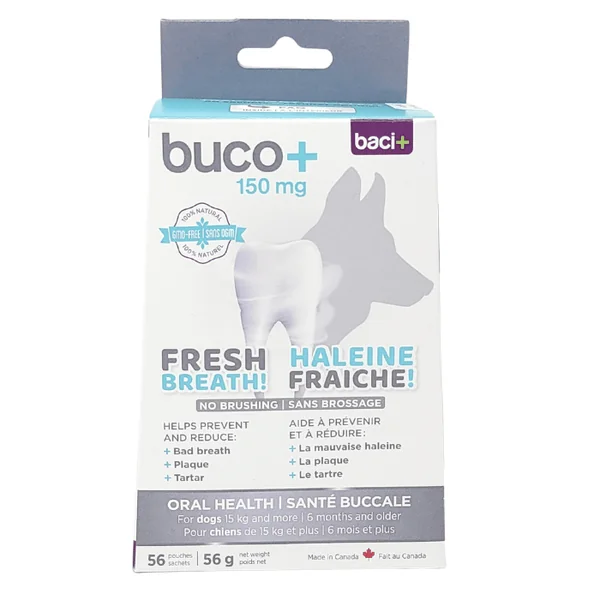 Buco+ est un supplément 100% naturel, efficace pour prévenir et diminuer les problèmes buccodentaires tels que la mauvaise haleine, le tartre et la plaque. Saupoudrer simplement sur la nourriture de votre animal pour une haleine fraîche, des dents et gencives en bonne santé et ce, sans brossage.