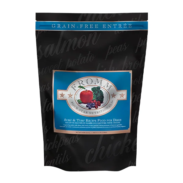 Une entrée sans céréales avec du saumon, du bouillon de poisson, du poulet, des pommes de terre et un assortiment de fruits et légumes. Disponible en 1.8kg et en 11.8kg.