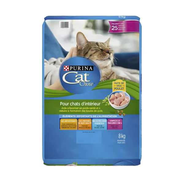 La nourriture Purina Cat Chow – Pour chats d’intérieur constitue une alimentation complète et équilibrée à 100 % pour les chats adultes. Cette nourriture sèche pour l’alimentation quotidienne est formulée pour convenir au mode de vie des chats adultes d’intérieur. Chaque repas leur fournit exactement l’apport en calories dont ils ont besoin, ainsi que 25 vitamines et minéraux essentiels, des antioxydants pour contribuer au maintien d’un mélange spécial de fibres pour aider à réduire la formation des boules de poils, ainsi que du vrai poulet.